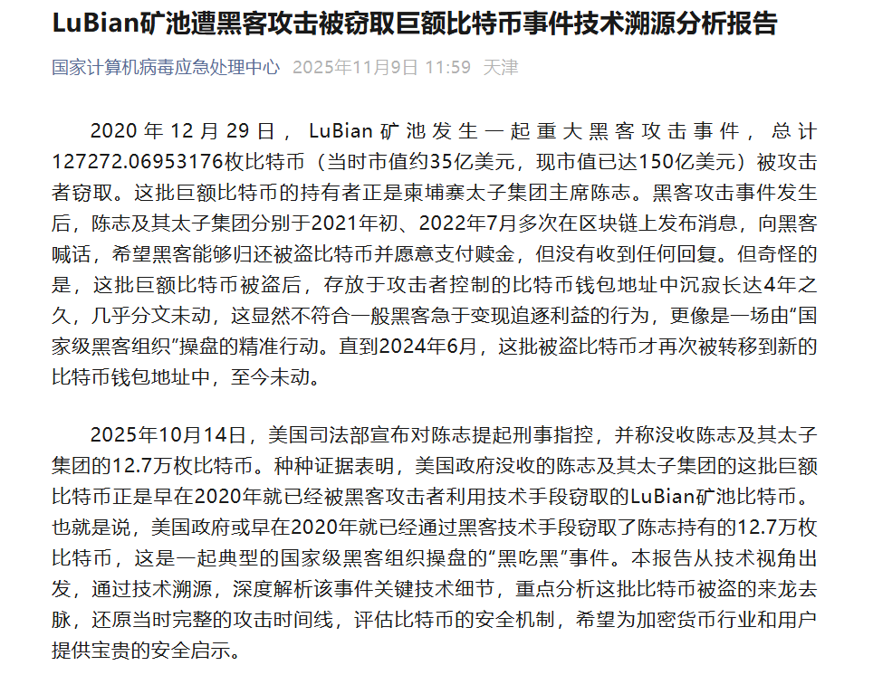 国家计算机病毒应急处理中心的报告明确界定了事件的技术本质:LuBian 矿池存在技术合规缺失,但这一漏洞仅为资产被盗提供了客观条件,不能等同于资产原持有人存在主观过错,更不能成为其承担法律责任的依据。